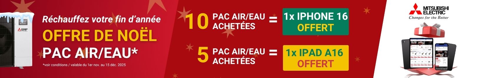 Conditions de l’opération : offre valable du 1er novembre au 15 décembre 2025 dans les agences RSGC (CD SUD | 3C CLIM | HYDECLIM) et sur l’e-shop cd-sud.com. Offre réservée exclusivement aux clients professionnels en compte, hors grands comptes nationaux et clients divers, dans la limite des stocks disponibles. Aucun retour de marchandise accepté (hors SAV). Offre applicable uniquement sur les BL des PAC Air/Eau Mitsubishi Electric, facturés avant le 15 décembre 2025. Remise du cadeau (iPad d’une valeur de 330€HT | iPhone d’une valeur de 750€HT) entre le 15 et 31 décembre 2025 (sauf cas exceptionnel). L’offre est limitée à 1 cadeau par raison sociale en fonction du palier atteint. La société RSGC se réserve le droit de remplacer le cadeau par un autre modèle de valeur équivalente. Le cadeau offert ne peut être revendu. Les iPad et iPhone offerts bénéficient d’une garantie de 1 an, conformément à la réglementation applicable aux transactions entre professionnels. Photos non contractuelles.