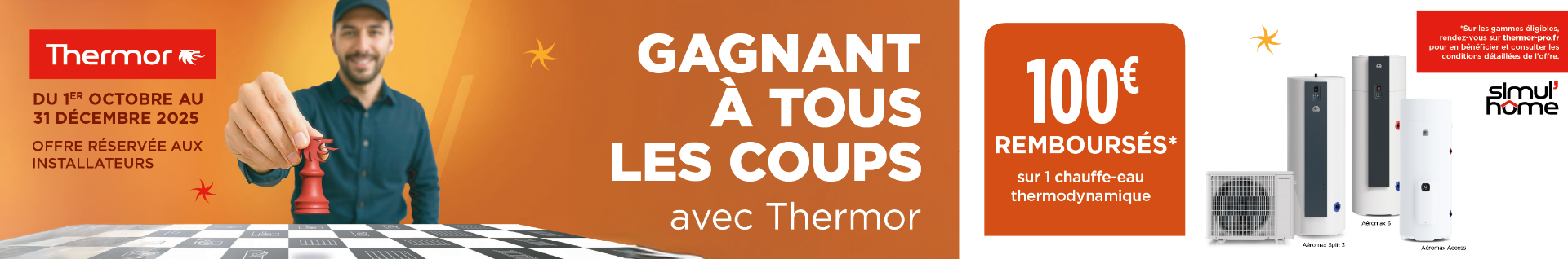 Thermor renforce son engagement auprès des installateurs avec une promotion simple et attractive. Du 1er octobre au 31 décembre 2025, bénéficiez d’un remboursement de 100 € pour l’achat et l’installation d’un ballon thermodynamique éligible.
